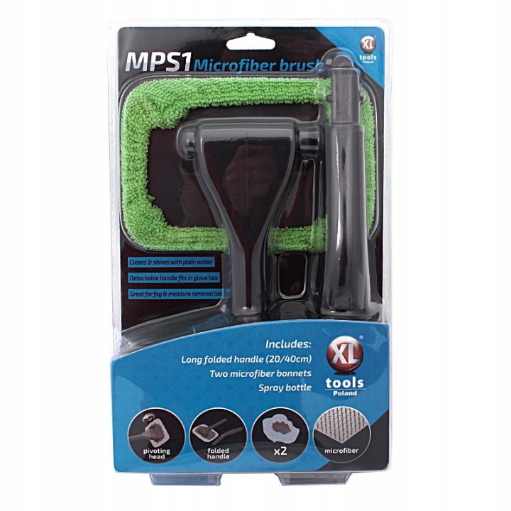 Myjka posiada ruchomą głowicę oraz długi trzon, dzięki czemu dotarcie nawet w najdalsze zakamarki nie bedzię więcej stanowić problemu. Jej prostokątny kształt ułatwia przecieranie rogów szyby. Ściereczka z mikrofibry doskonale pochłania wilgoć. Po złożeniu rączki zajmuje niewiele miejsca.