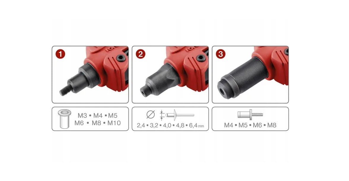 - Model Combo trzy funkcje (3w1): nitowanie nakrętek, nitowanie nitów oraz nitowanie nitonakrętek