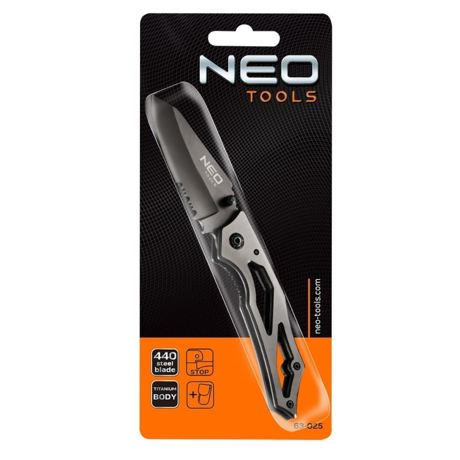 Nóż składany z blokadą NEO posiada ostrze wykonane ze stali 440 o długości 7 cm. Tytanowa obudowa zapewnia długą żywotność narzędzi. Blokada przed nieoczekiwanym zamknięciem zapewnia bezpieczeństwo podczas pracy. Pokrowiec z wytrzymałego nylonu ułatwia przechowywanie i transport. Marka NEO spełnia oczekiwania profesjonalistów.