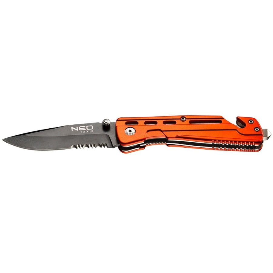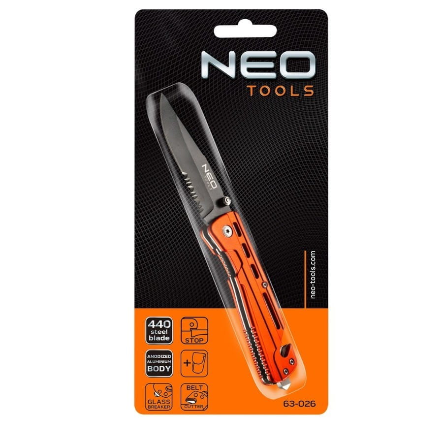Nóż składany z blokadą NEOposiada ostrze wykonane ze stali 440 o długości 8.5 cm. Blokada przed nieoczekiwanym zamknięciem zapewnia bezpieczeństwo podczas pracy. Korpus z anodowanego aluminium zwiększa trwałość produktu i odporność na korozję. Specjalne ostrze umożliwia przecięcie pasa, co znacznie ułatwia oswobodzenie podczas zagrożenia w samochodzie. Pokrowiec z wytrzymałego nylonu ułatwia przechowywanie i transport. Marka NEO spełnia oczekiwania profesjonalistów.
