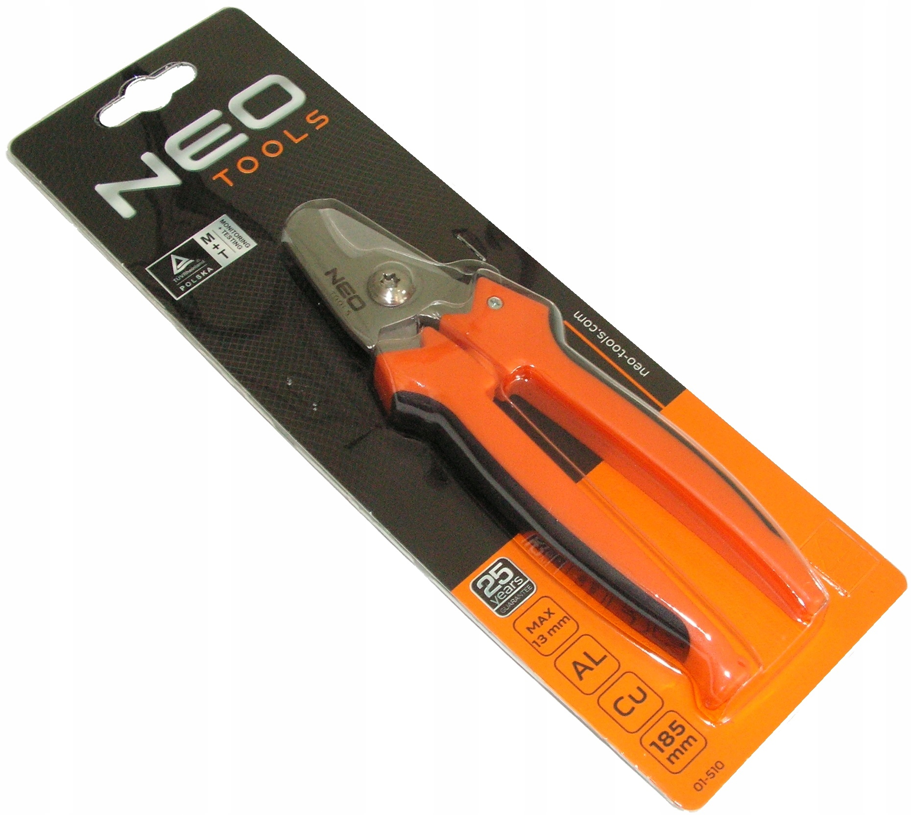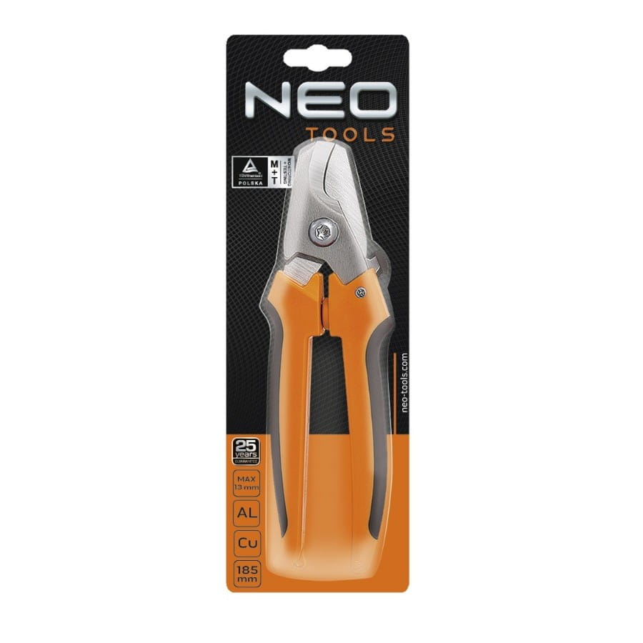 Obcinak do kabli miedzianych i aluminiowych NEO (nr ref. 01-510) z ostrzami sierpowymi, o wymiarze 185 mm. Hartowane szczęki tną do maksymalnej średnicy 13 mm.