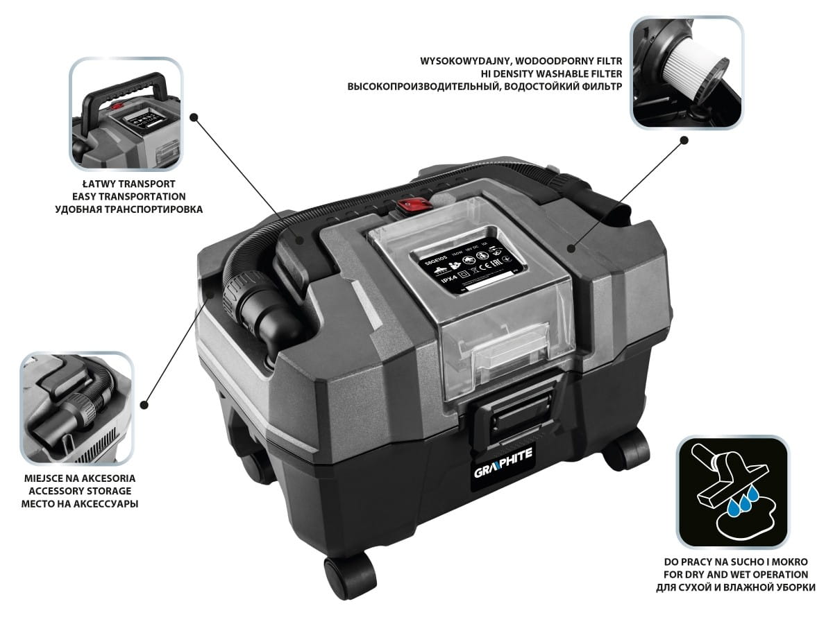 Odkurzacz warsztatowy Energy+ 18V, Li-Ion, 10 L GRAPHITE (nr