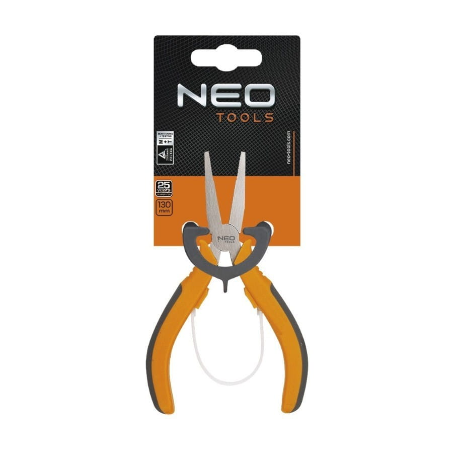 Szczypce precyzyjne płaskie NEO (nr ref. 01-105) o wymiarze 130 mm. Długie, płaskie, ząbkowane szczęki zapewniają mocny chwyt. Wytrzymała nylonowa sprężyna ułatwia pracę. Dwumateriałowa, ergonomiczna rękojeść podnosi komfort użytkowania. Jakość narzędzia potwierdzona certyfikatem TÜV i 25-letnią gwarancją producenta. Marka NEO spełnia oczekiwania profesjonalistów.- Ilość sztuk w zestawie: 1 szt
