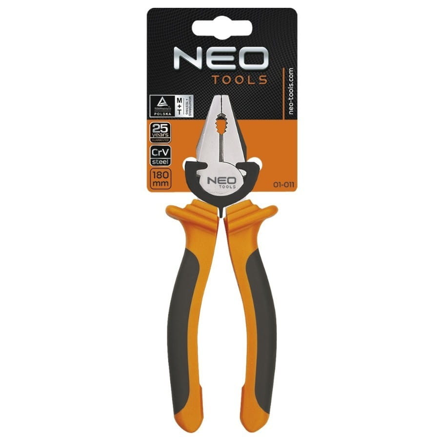 Szczypce uniwersalne 180 mm, 01-011, NEO są wyprodukowane zgodnie z normą DIN 5746, co świadczy o wysokiej wytrzymałości produktu. Do produkcji szczęk użyto stali hartowanej indukcyjnie (55-60 HRC), dzięki czemu szczypce zapewniają skuteczne cięcie i kształtowanie twardych drutów. Produkt został wyposażony w dwumateriałową, ergonomiczną rękojeść podnoszącą komfort użytkowania. Jakość narzędzia potwierdza certyfikat TÜV. Marka NEO spełnia oczekiwania profesjonalistów.