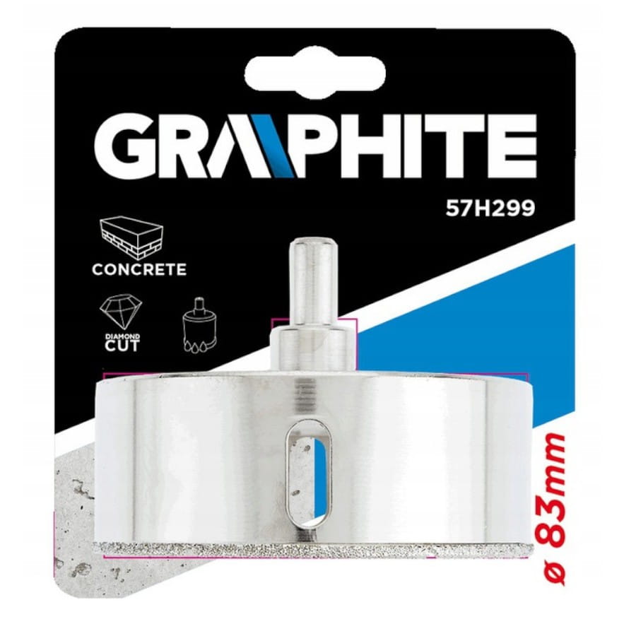 Wiertło diamentowe GRAPHITE (nr ref. 57H299) o średnicy 83.0 mm posiada ostrze, galwanicznie pokryte nasypem diamentowym. Pozwala to wiercić otwory w bardzo twardych materiałach ceramicznych i mineralnych (gres, granit, marmur).