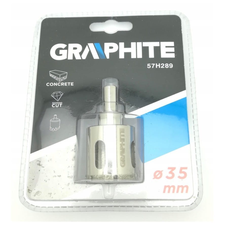 Wiertło diamentowe GRAPHITE (nr ref. 57H289) o średnicy 35.0 mm posiada ostrze, galwanicznie pokryte nasypem diamentowym. Pozwala to wiercić otwory w bardzo twardych materiałach ceramicznych i mineralnych (gres, granit, marmur).