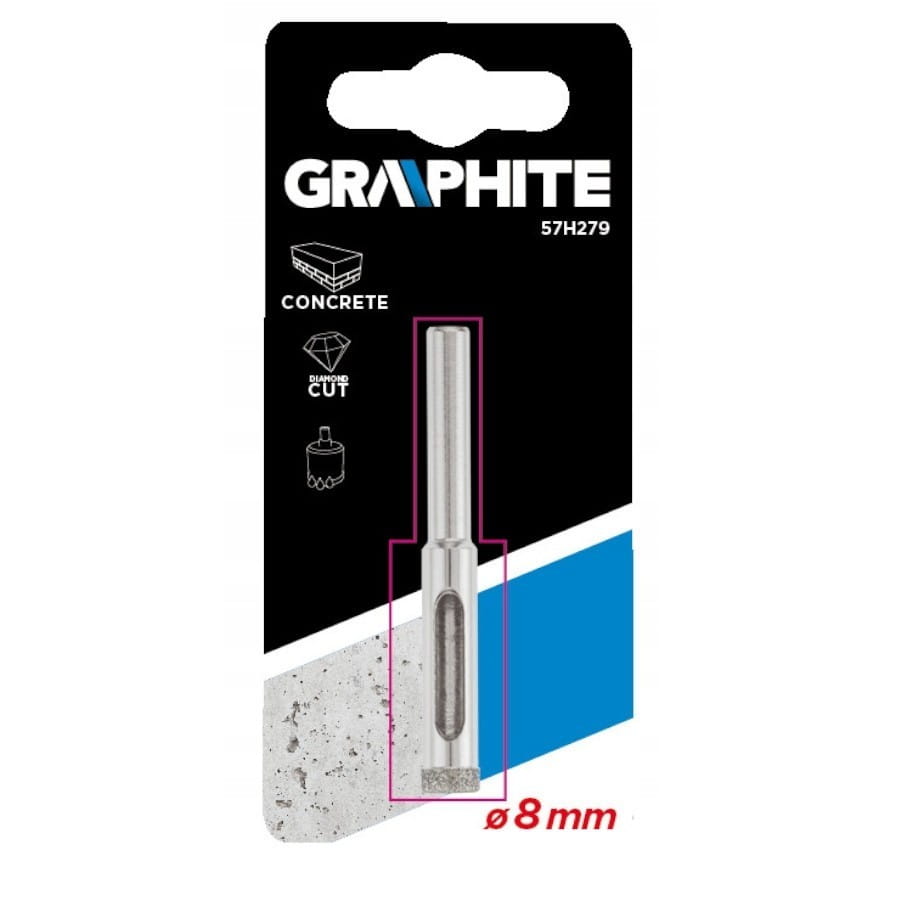 Wiertło diamentowe GRAPHITE (nr ref. 57H279) o średnicy 8.0 mm posiada ostrze, galwanicznie pokryte nasypem diamentowym. Pozwala to wiercić otwory w bardzo twardych materiałach ceramicznych i mineralnych (gres, granit, marmur).