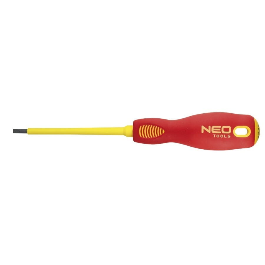 Wkrętak płaski 1000V NEO.Atestowany do pracy pod napięciem do 1000 V.Grot wkrętaka wykonany jest z wyjątkowo wytrzymałej stali chromowo-molibdenowej. Końcówka robocza grota została poddana obróbce cieplnej, dzięki czemu uzyskano odpowiednią twardość i odporność na zgięcia 56 HRC.Trójgraniasty kształt uchwytu z wyprofilowanym oparciem dla kciuka zmniejsza obciążenie dłoni podczas pracy i ułatwia uzyskanie optymalnego momentu obrotowego. Dwumateriałowy uchwyt zapobiega ślizganiu się w dłoni, odporny jest na działanie chemikaliów, olejów i smarów.