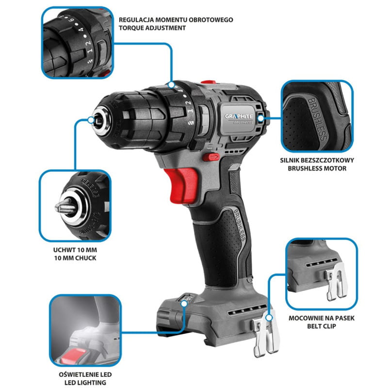 Wiertarko-wkrętarka 18V uchwyt 10mm 58GE139 GRAPHITE to kompaktowe i wydajne narzędzie przeznaczone do wiercenia i wkręcania w różnych materiałach. Dzięki bezszczotkowemu silnikowi oraz solidnej konstrukcji, urządzenie zapewnia wysoką wydajność pracy i długą żywotność.